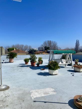 L’appartamento, con ingresso indipendente, si sviluppa al piano primo per circa 200 mq ed è composto da ingresso, ampio soggiorno con balcone, sala da pranzo con cucinotto, tre camere da letto, bagno, due ripostigli e grande terrazza esclusiva di circa 185 mq. Completano la proprietà soffitta di circa 200 mq e ripostiglio al piano terra.
